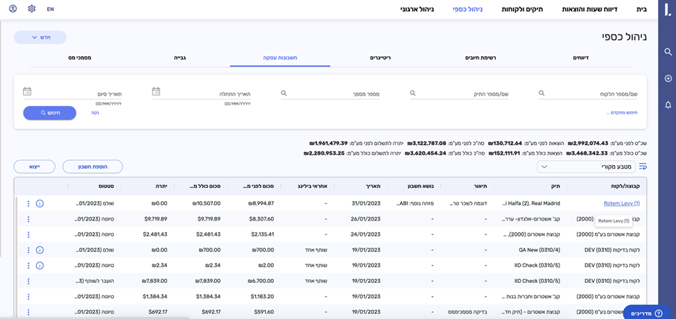 במסכי הניהול הכספי: ריטיינרים, חשבונות עסקה, גבייה, מסמכי מס (כל תתי-העמודים תחת מסמכי מס): הטקסט של מספר חשבון, שם הלקוח ושם התיק הם לינקים לחיצים (כשנרחף עם העכבר על אחד מהפרטים הרלוונטים, הטקסט יופיעו בכחול עם קו מתחתיו – חיווי שזהו לינק שניתן ללחוץ עליו).