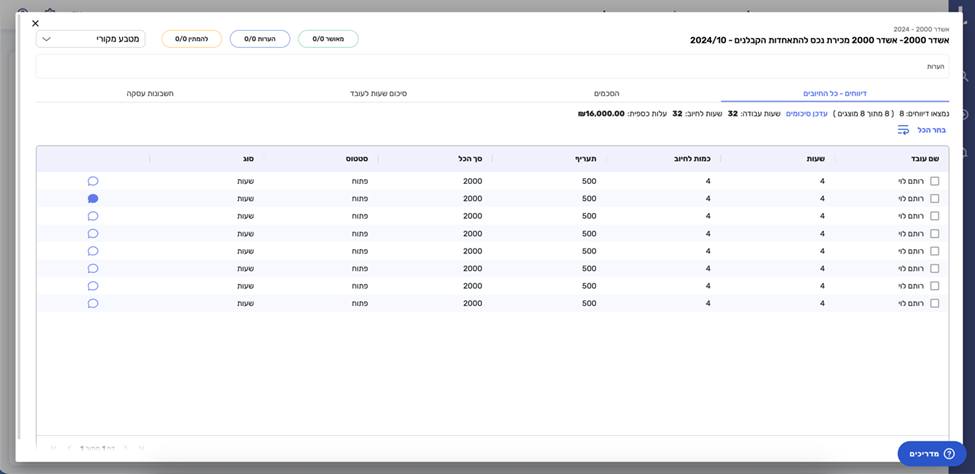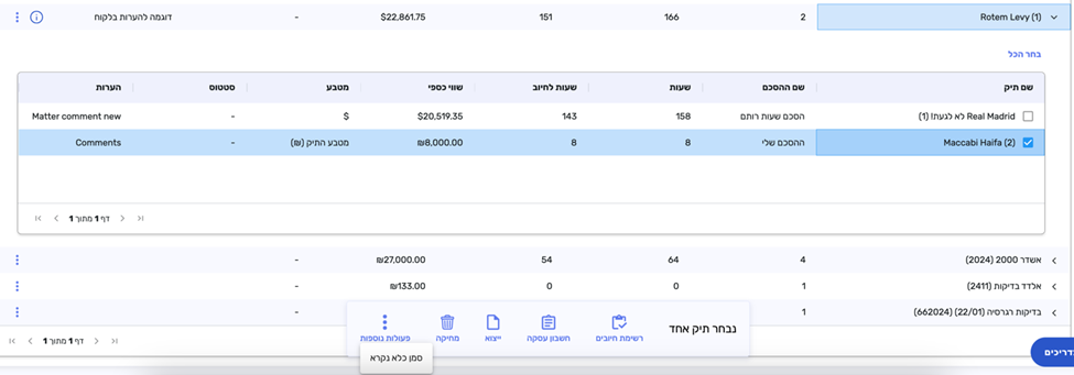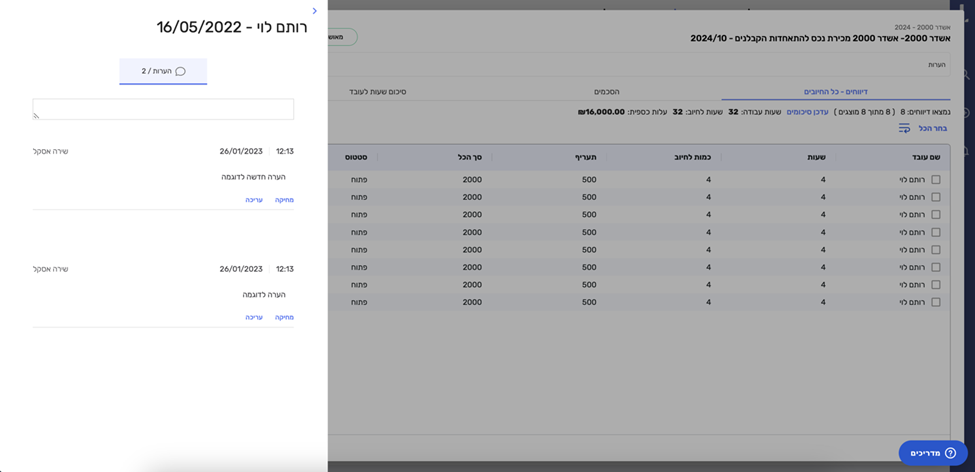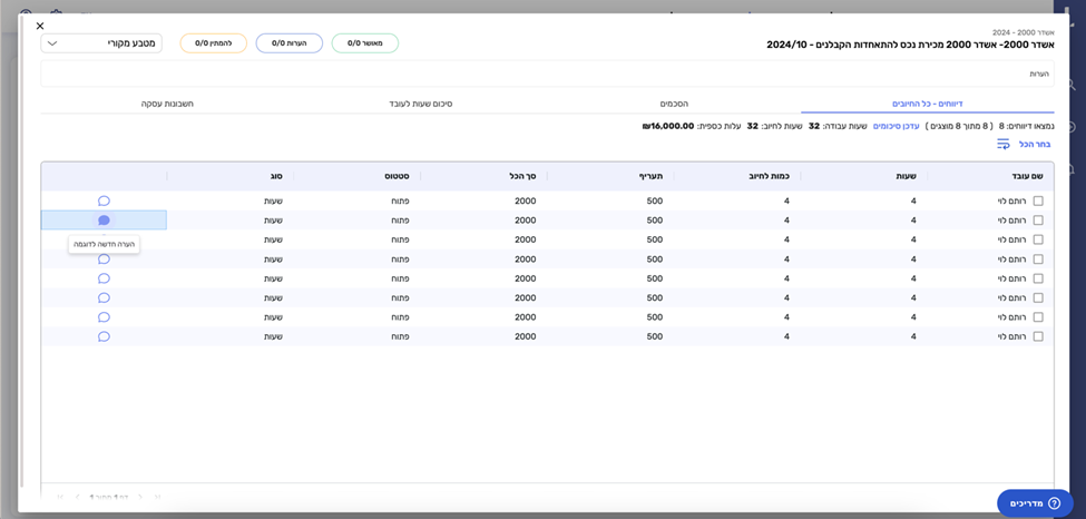 רשימת החיובים > תת-טבלת התיקים > חלונית הדיווחים בתיק – הערות ברמת דיווח