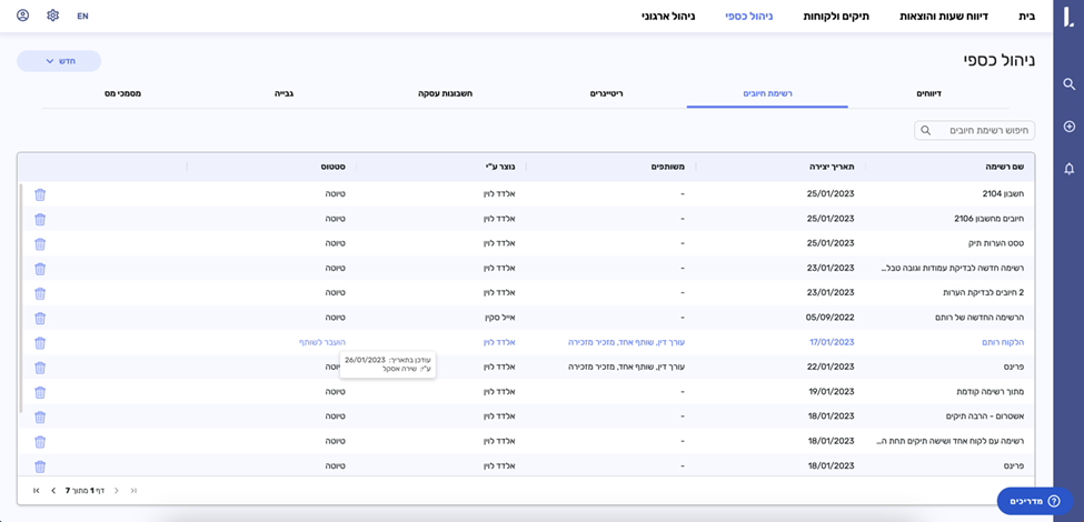 בעמודת רשימת החיובים בו מוצגות כל הרשימות, ניתן לרחף עם העכבר מעל סטטוס של כל שורת רשימה ולראות באיזה תאריך ועל ידי מי עודכן סטטוס הרשימה.