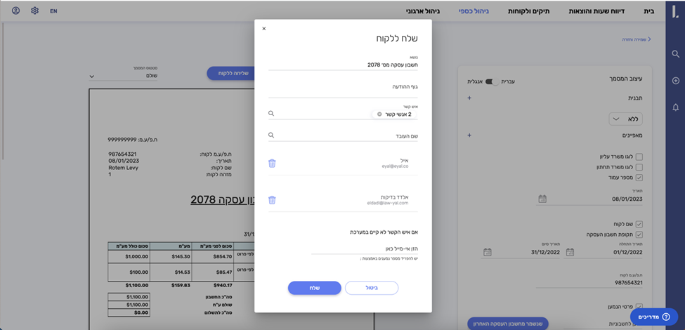 בהמשך להגדרת הנמענים לפי סוג המסמך, כשנרצה לשלוח ללקוח חשבון עסקה או מסמך מס מכל סוג שהוא, בעמוד עיצוב המסמך > לחיצה על כפתור ״שליחה ללקוח״ ובחלונית השליחה ללקוח פרטי אנשי הקשר הנמענים ימולאו אוטומטית.