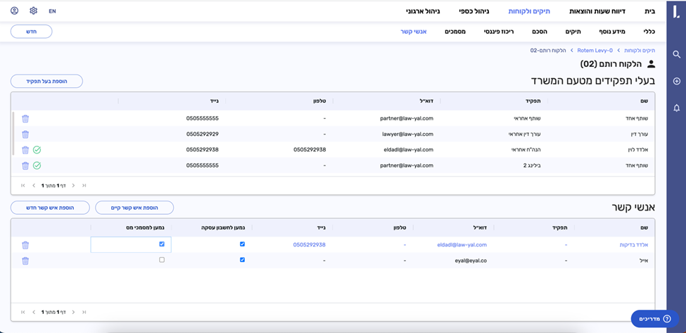 בעמוד קבוצה/ לקוח/ תיק – בלשונית ״אנשי קשר״, נוסיף את אנשי הקשר הקבוצה/ הלקוח/ התיק. במידה ואיש הקשר שהוספנו צריך לקבל חשבונות עסקה או מסמכי מס, נסמן V בטבלה בעמודה הרלוונטית ובכך נגדיר את איש הקשר כנמען לחשבונות עסקה ו/או מסמכי מס.