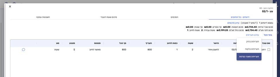 חשבון עסקה > בחלונית עריכת הדיווחים של התיק, הוספנו בכפתור ״עדכון תעריפים״ אופציה נוספת: ״תעריפים משנה קודמת״.