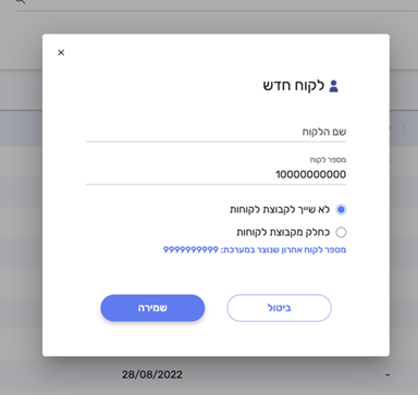 בפתיחת לקוח חדש: המערכת תשלים עבורנו מספר לקוח ובהודעה כחולה בתחתית החלונית מוצג מספר הלקוח האחרון שנפתח במערכת. ניתן לערוך את מספר הלקוח שהמערכת משלימה באופן אוטומטי. ניתן לשייך את הלקוח לקבוצת לקוחות במידת הצורך.