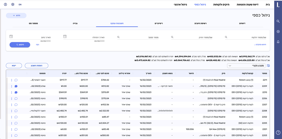 בכל אחד מעמודי הניהול הכספי (למעט רשימת החיובים והריטיינרים) נוכל ב״חיפוש מתקדם״ לחפש לפי חברת בת.