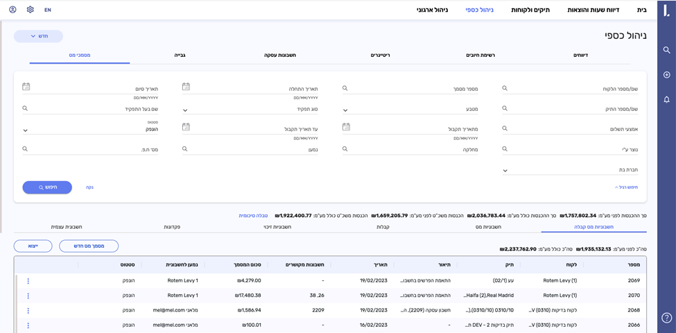 ניהול כספי > מסמכי מס, חשבונות עסקה, גבייה, דיווחים – חיפוש לפי ״חברת בת״