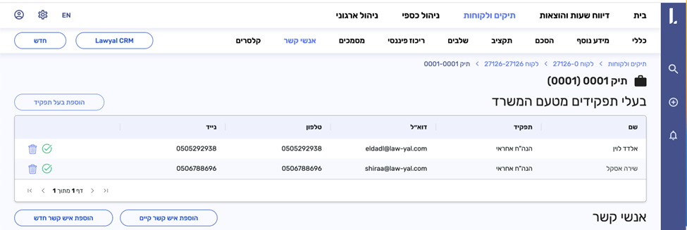 בלחיצה על כפתור ׳הוספת בעל תפקיד׳ ניתן להוסיף אני קשר ואנשי קשר גורמים מאשרים שיוגדרו ספציפית ברמת התיק.
