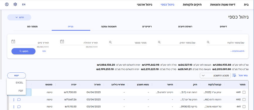 - מסך גבייה > ייצוא לEXCEL > מפורט