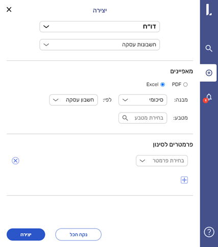 פלוס > דו"ח > חשבונות עסקה > EXCEL > סיכומי > לפי חשבון