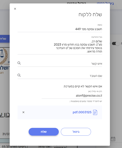 - בשליחת חשבון מתוך המערכת ללקוח או לאישור שותף ניתן לצרף קובץ נוסף מתוך המחשב