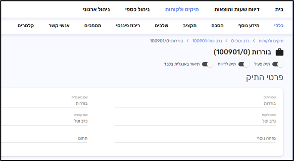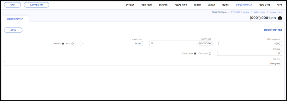 בלשונית זו ניתן להגדיר פרטים כלליים על החיוב בתיק, בין אם מודבר בהנחת חשבון קבועה באחוזים, מטבע החשבון, שפה וכו'.