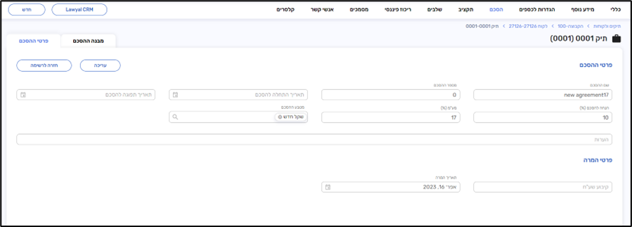 כרטיסיית פרטי ההסכם מאפשרת שינויים בפרטים כלליים על הסכם שכר הטרחה כמו שם ההסכם, תוקף ההסכם בתאריכים, הערות כלליות לצפייה פנימית.