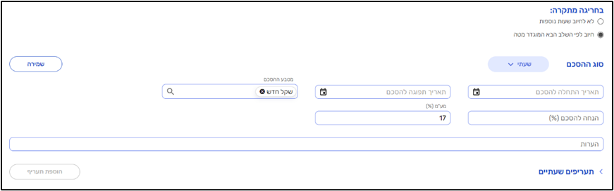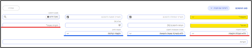 תקופה וסכום (מסומנים בצהוב) הם שדות חובה כמו עד היום, והוספנו כמה שדות חדשים: תקרת שעות ותקופה לתקרה (מסומנים באדום), משיכת שעות אוטומטית ותקופה לחיוב (מסומנים בכחול)
