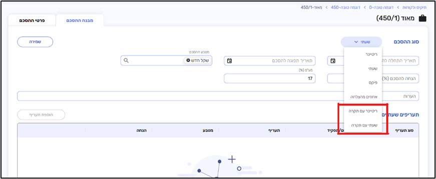 בחלון הזה מוצג הסכם-המשך להסכם שכבר הגדרתי וגם אותו ניתן להגדיר כריטיינר עם תקרה.
