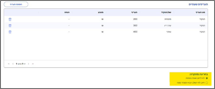 לאחר לחיצה על שמירה ניתן להוסיף תעריפים שעתיים כמו עד היום.