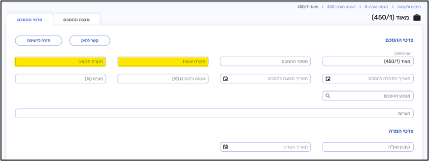 יש להכניס שם הסכם, ובמידת הצורך תקרת שעות או תקרת תקציב (מסומנים בצהוב בתמונה)