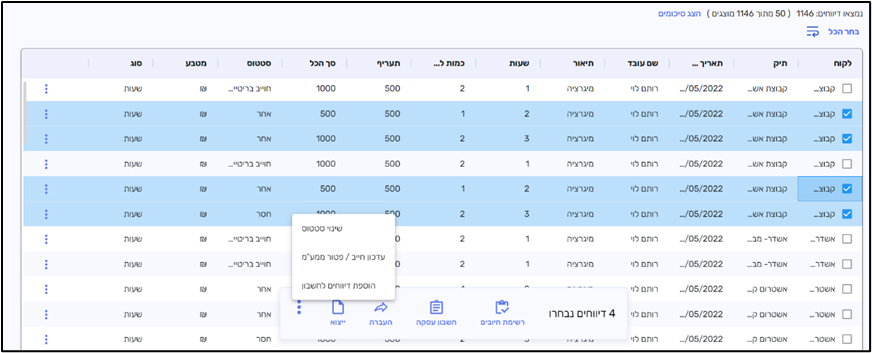אחרי שמחפשים את הדיווח > סימון הדיווח באמצעות הריבוע בצד ימין > נפתח סרגל צף למטה > שלוש נקודות > הוספת דיווחים לחשבון