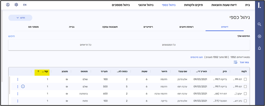 תוספת עמודת "קוד חיוב" לחלון תצוגת הדיווחים.