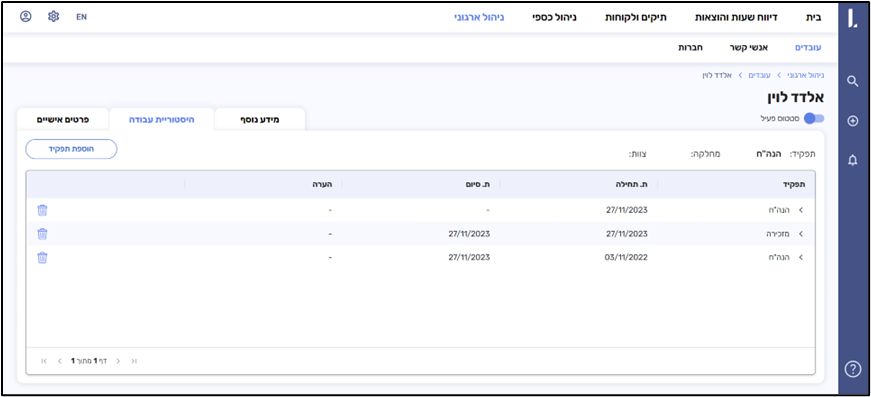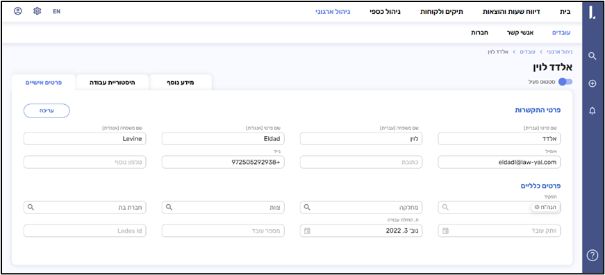 בלחיצה על שורת עובד, במקום פתיחת החלון מימין, תפתח לשונית חדשה עם עמוד עובד המכיל: