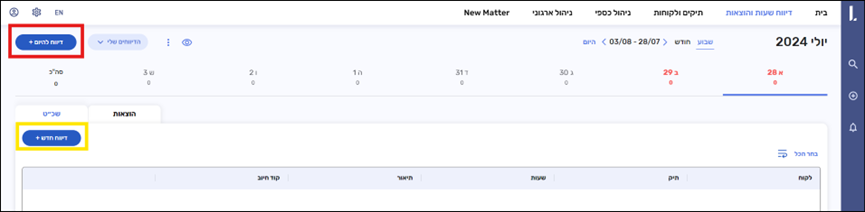 שינוי קל בכפתורים בלשונית דיווח שעות והוצאות – לפי המסומן בתמונה מטה: