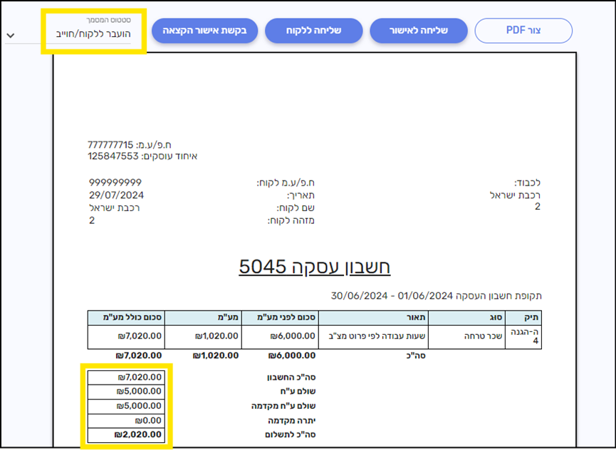 הפקנו חשבון ע"ס 1000$ והעברנו אותו לסטטוס 'הועבר ללקוח/חוייב'