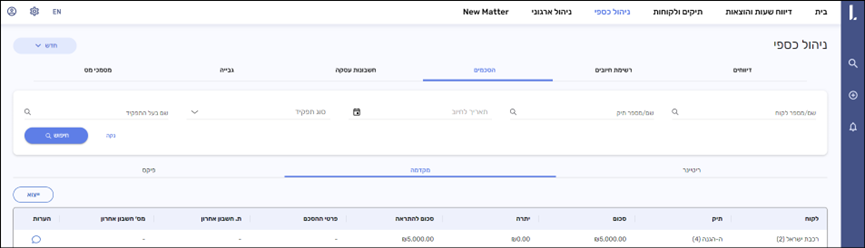 במעבר בין כרטיסיות בלשונית 'ניהול כספי' – הסינונים של לקוח ותאריכים נשמרים.