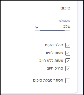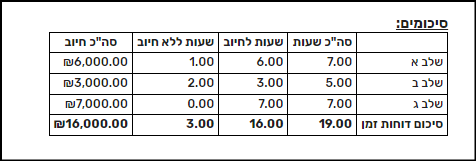 בתיקים בהם מוגדרים שלבים ניתן לסכם את השעות וההוצאות בתיק בדו"ח PDF ולבחור שטבלת הסיכום תסתדר לפי שלב: