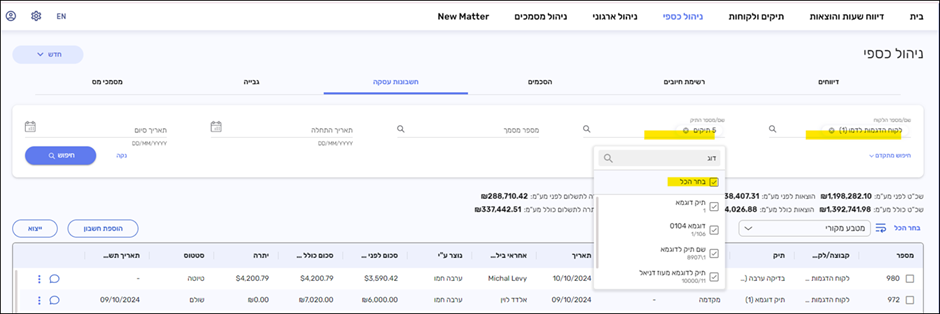 - נוספה עמודת "נושא החשבון, מוצגת כברירת מחדל, ניתן להסתיר במידת הצורך.