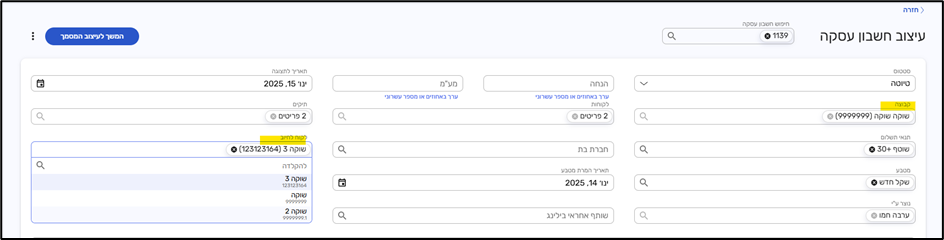 בעמוד הראשי של החשבון 'עיצוב חשבון עסקה' – נוסף שדה "לקוח לחיוב"
