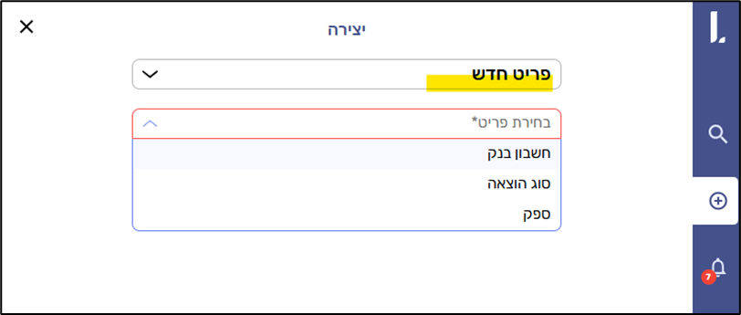 על מנת להוסיף פריט יש ללחוץ על הפלוס בסרגל הכחול מצד ימין > פריט חדש > ולבחור את הפריט אותו תרצו להוסיף.