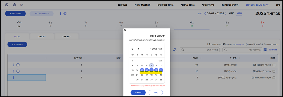 בשעות והוצאות ניתן לבחור תצוגה לפי תיק או לקוח