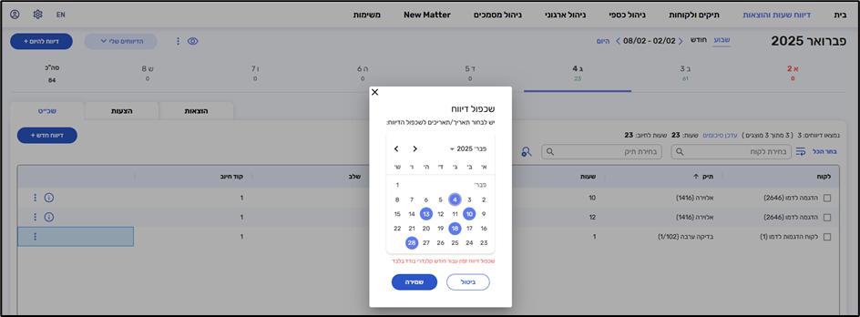 שכפול – ניתן לגרור ולבחור מס' תאריכים לשכפול,