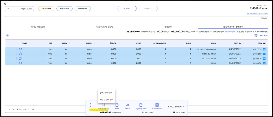 בחלון דיווחי תיק – בבחירת דיווחים ניתן לעדכן תעריפים לפי התיק או הלקוח (כמו בחשבון עסקה)