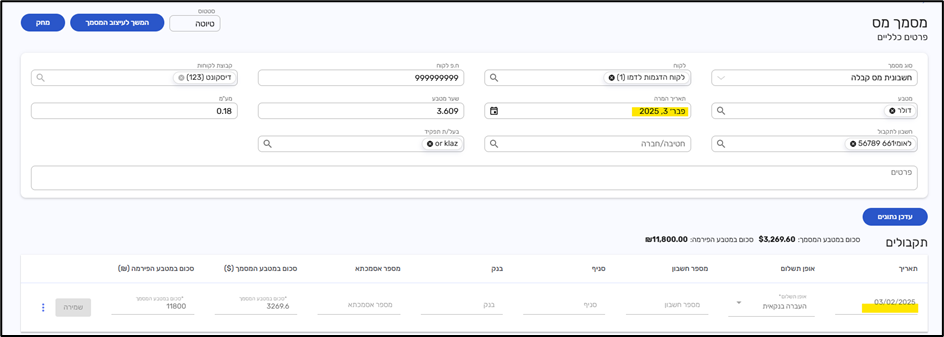למשל: הפקתי מסמך מס חדש בתאריך 5.2.25 ותאריך התקבול שלי היה ב 3.2.25 תאריך ההמרה של המסמך יתעדכן ל 3.2.25