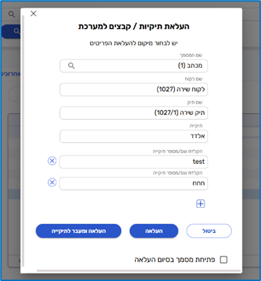 - צ'ק בוקס פתיחת מסמך בסיום העלאה - מאפשר לבחור האם לפתוח את המסמך בסיום או להעלות אותו בלבד, ללא פעולות נוספות.