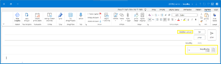 - בלחיצה על הכפתור, ייפתח מייל חדש עם לוג הפעולות לשליחה לצוות התמיכה (כתובת המייל לשליחה תוזן אוטומטית). כל שעליכם לעשות הוא ללחוץ על כפתור שליחת המייל: