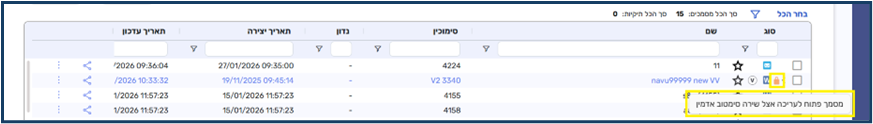 נוסף חיווי בטבלה למסמך שפתוח לעריכה אצל משתמש אחר (סימן המנעול). בריחוף מעל המנעול יוצג שמו של העובד שהמסמך פתוח אצלו לעריכה.